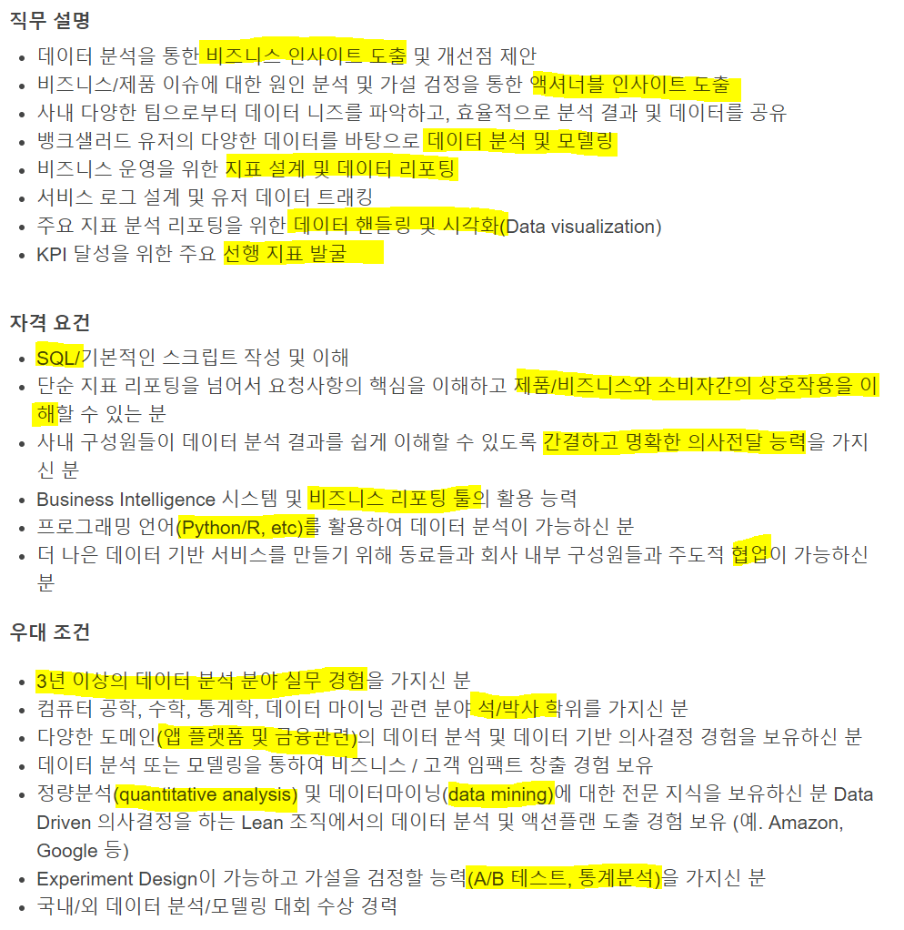 다음은 비슷한 회사인 뱅크샐러드의 Data Analyst 포지션 채용공고이다.