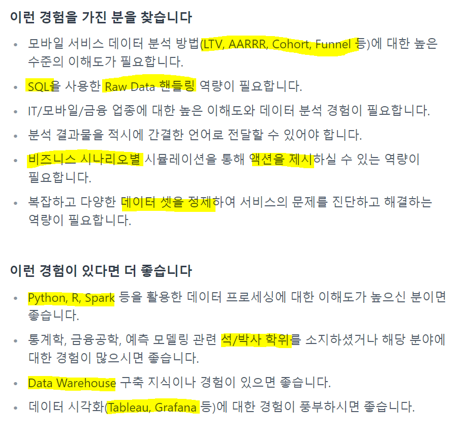 모바일 서비스가 메인 BM이다보니, 기본적인 Data Analyst 의 요구사항과 추가적으로 모바일 서비스에 대한 기본적인 이해도 필요해 보인다.
