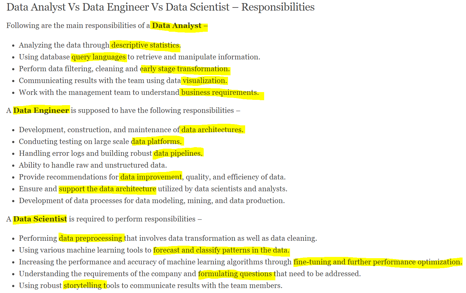 위 내용에 따르면, Data Analyst는 기본적인 통계분석을 하고, 쿼리로 데이터를 가져와 전처리하고 시각화해서 보여준다.